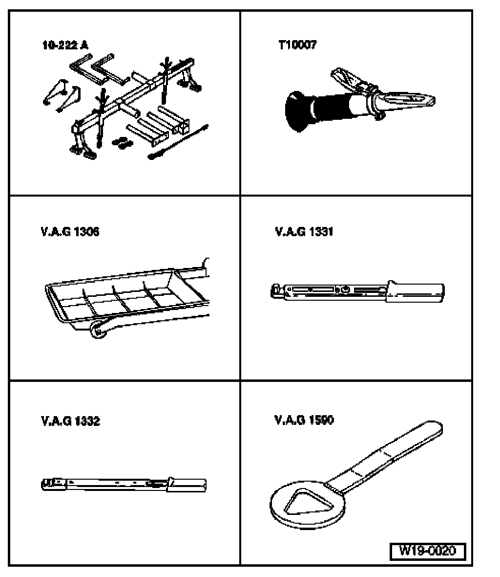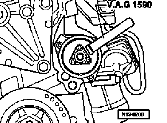 - Remove belt pulley. Counter-support belt pulley with water pump wrench VAG 1590 when doing this.