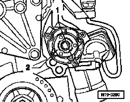 - Unscrew coolant pump securing bolts -1- and remove coolant pump -2