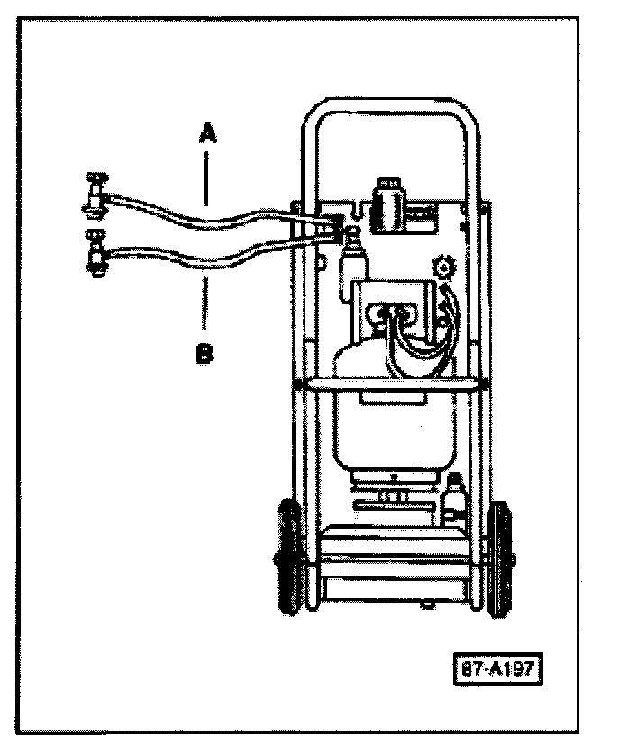 - Connect red high-pressure hose -A- of refrigerant recovery/recycling/recharging unit to high side fitting on vehicle and open coupler valve.