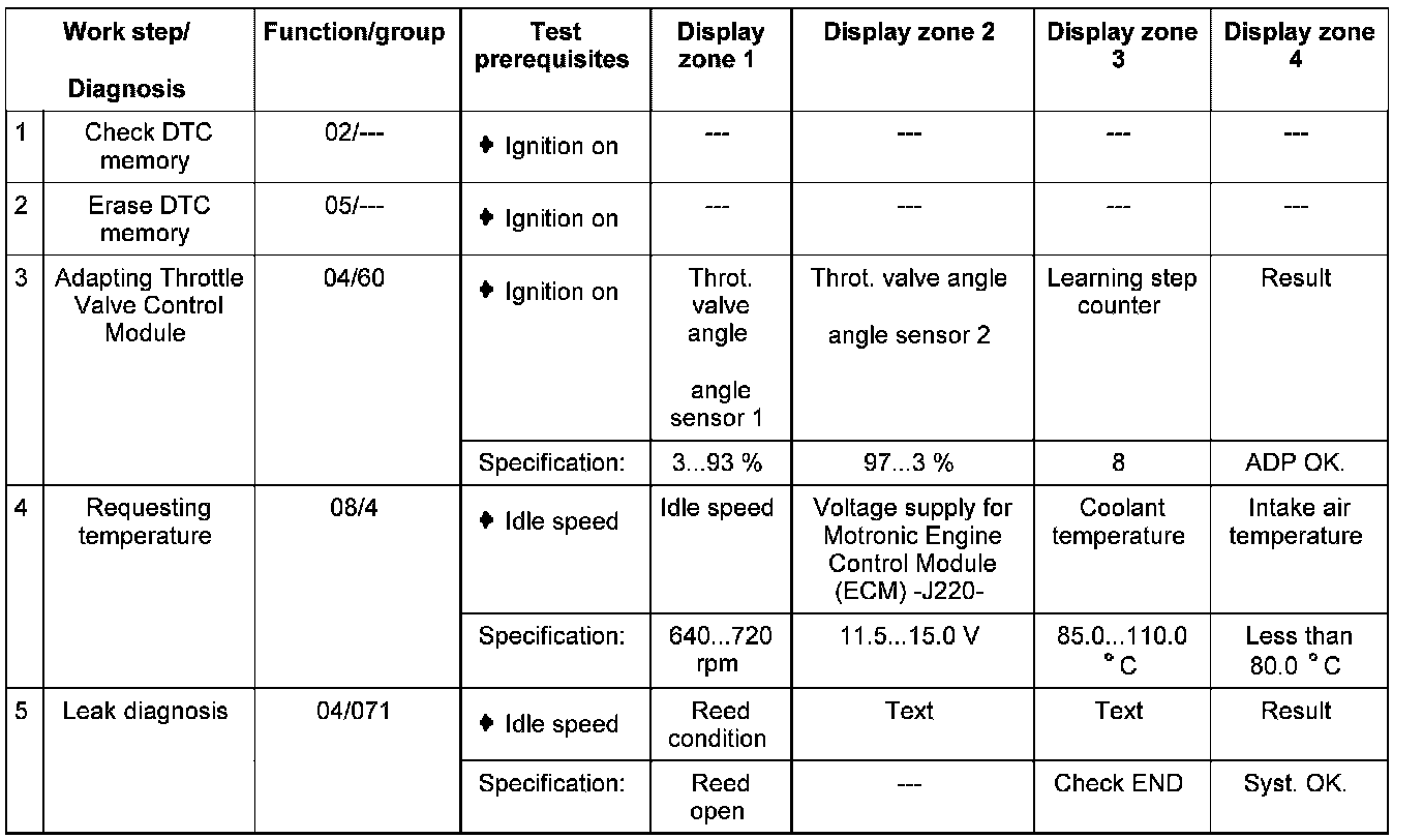 If the diagnosis is initiated by the Motronic Engine Control Module (ECM) -J220- the display in display zone 4 jumps from "Test OFF" to "Test ON".