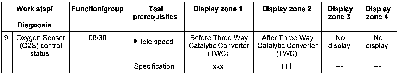 - Check Oxygen Sensor (O2S) control status after Three Way Catalytic Converter (TWC) (display zone 2): Specification: 111