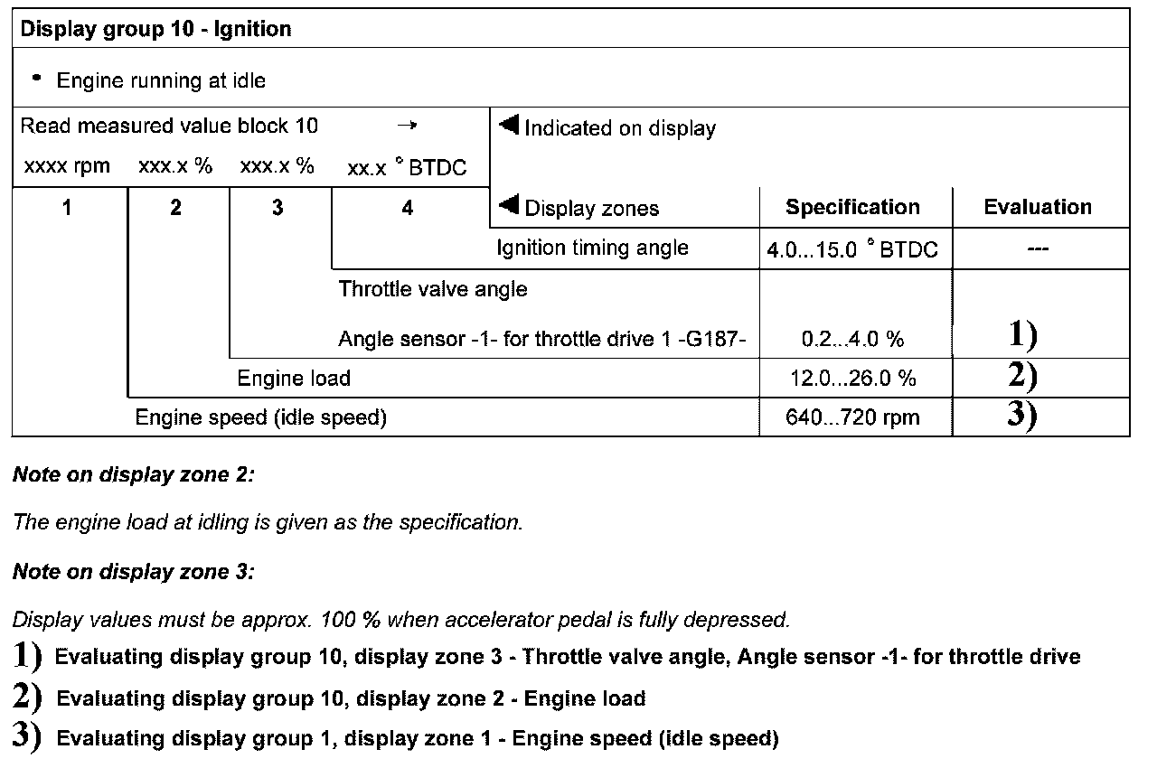 Evaluating display group 10, display zone 3 - Throttle valve angle, Angle sensor -1- for throttle drive
