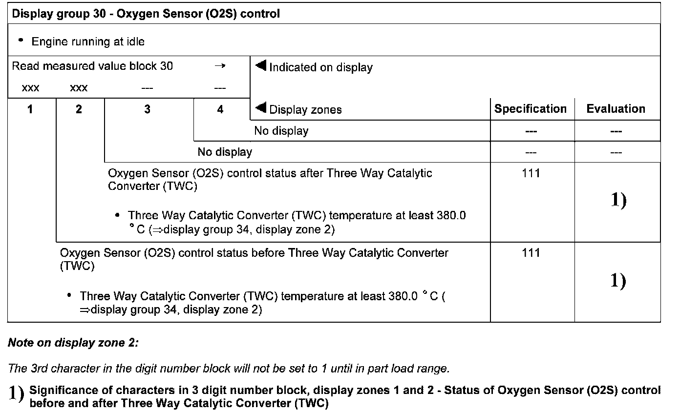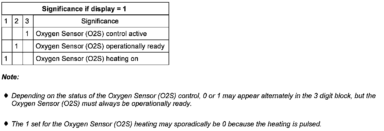 Significance of characters in 3 digit number block, display zones 1 and 2 - Status of Oxygen Sensor (O2S) control before and after Three Way Catalytic Converter (TWC)