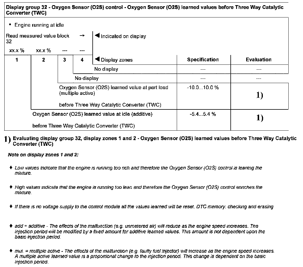 Evaluating display group 32, display zones 1 and 2 - Oxygen Sensor (O2S) learned values before Three Way Catalytic Converter (TWC)