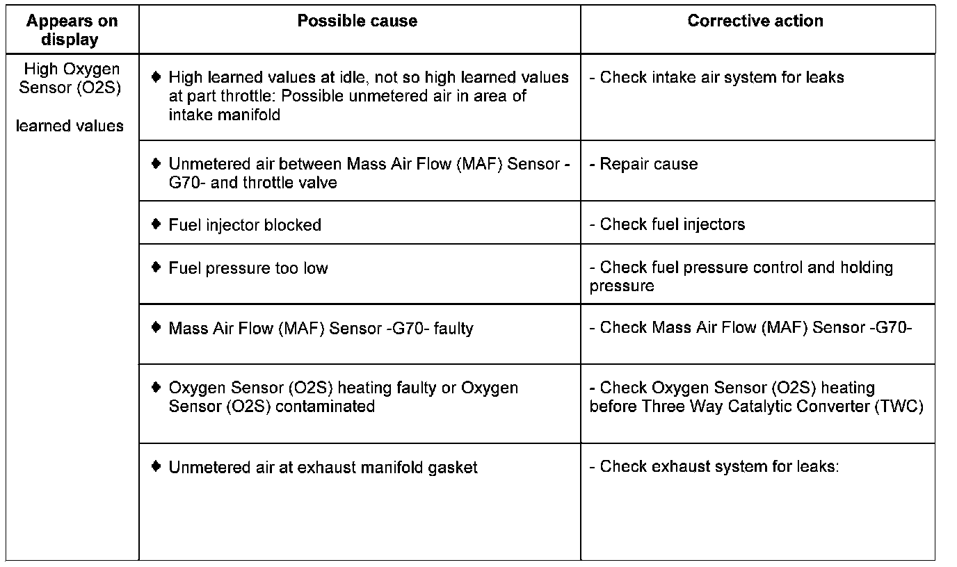 - High values indicate that the engine is running too lean and therefore the Oxygen Sensor (O2S) control enriches the mixture.