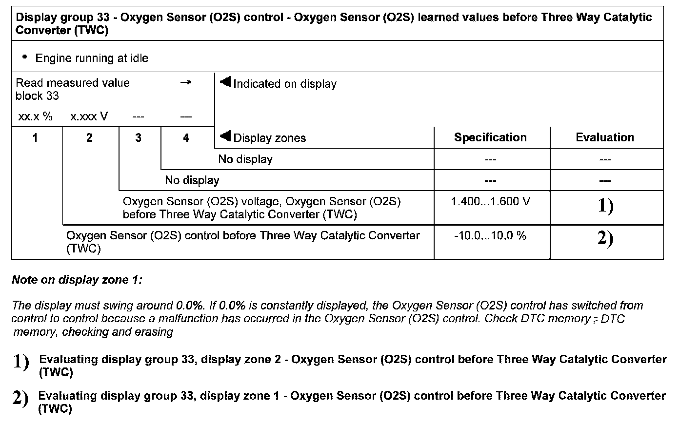 Evaluating display group 33, display zone 1 - Oxygen Sensor (O2S) control before Three Way Catalytic Converter (TWC)