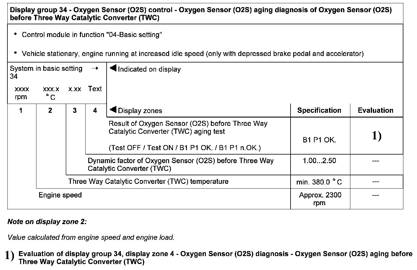 Evaluation of display group 34, display zone 4 - Oxygen Sensor (O2S) diagnosis - Oxygen Sensor (O2S) aging before Three Way Catalytic Converter (TWC)