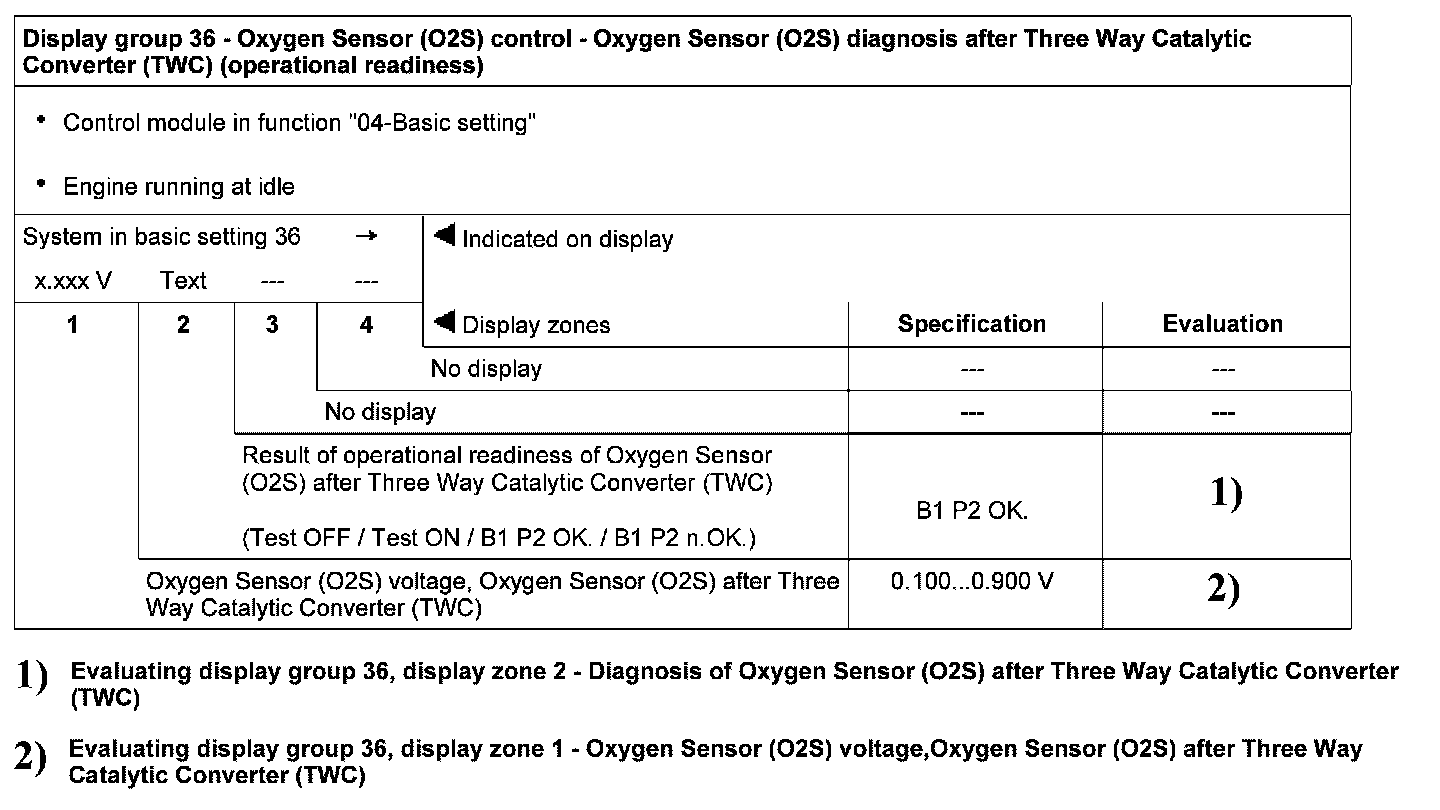Evaluating display group 36, display zone 2 - Diagnosis of Oxygen Sensor (O2S) after Three Way Catalytic Converter (TWC)
