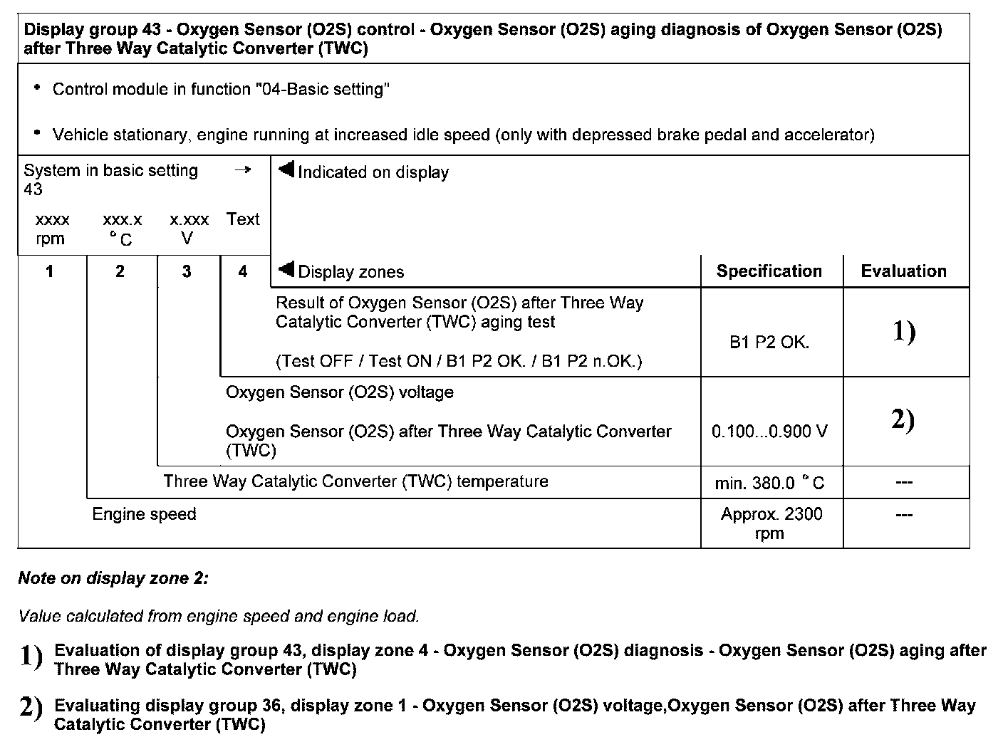 Evaluation of display group 43, display zone 4 - Oxygen Sensor (O2S) diagnosis - Oxygen Sensor (O2S) aging after Three Way Catalytic Converter (TWC)