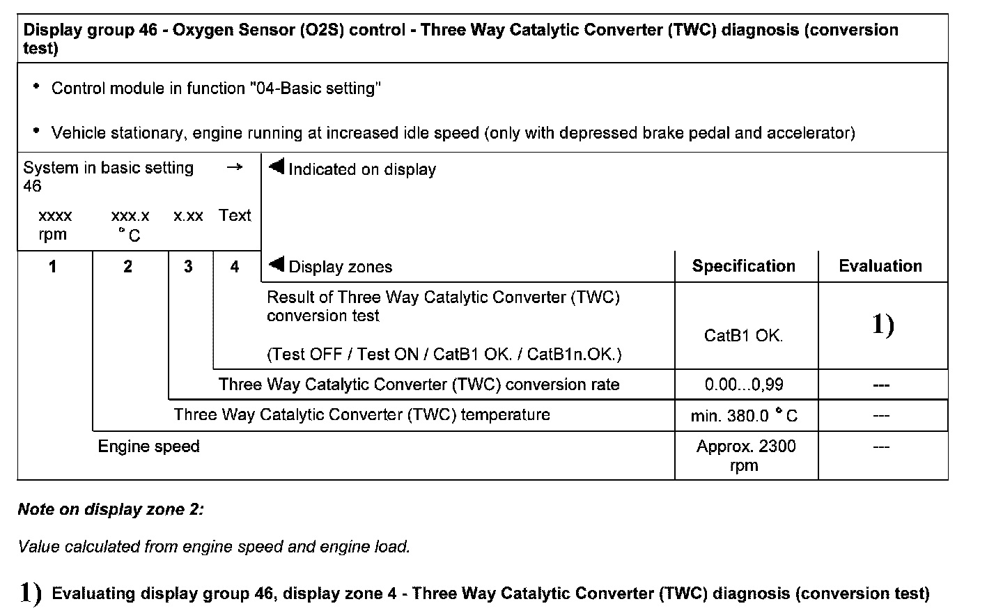 Evaluating display group 46, display zone 4 - Three Way Catalytic Converter (TWC) diagnosis (conversion test)
