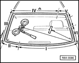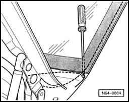 - Push cutting cord through adhesive sealant into vehicle interior using awl (from V.A.G1474A).