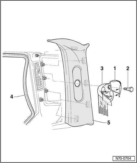- Remove bolt - 2 - and remove belt relay - 3 -.