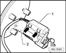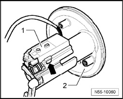 - Disengage catches - arrows - of micro-switch - 1 - from lock cylinder housing - 2 -.