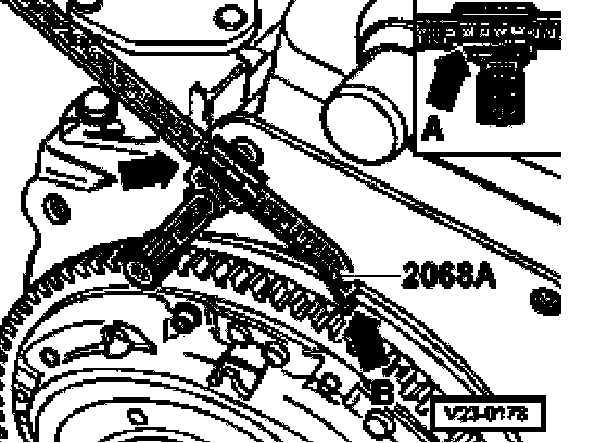 - Turn crankshaft until flywheel TDC marking aligns with point on setting device -arrow B-.