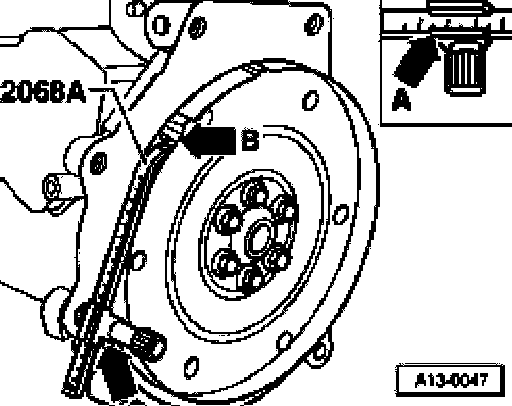 - Turn crankshaft until flywheel TDC marking aligns with point of setting device -arrow B-.