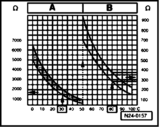 Range A displays resistance values for the temperature range of 0...50 degrees C, range B displays resistance values for the temperature range of 50...100 degrees C.