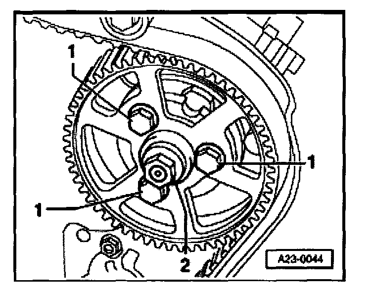 - Loosen two injection pump sprocket mounting bolts -1-.