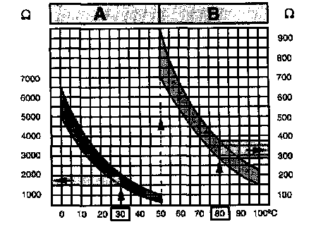 Scale A shows resistance values for temperature range 0 to 50°C and scale B the values for temperature range 50 to 100°C.