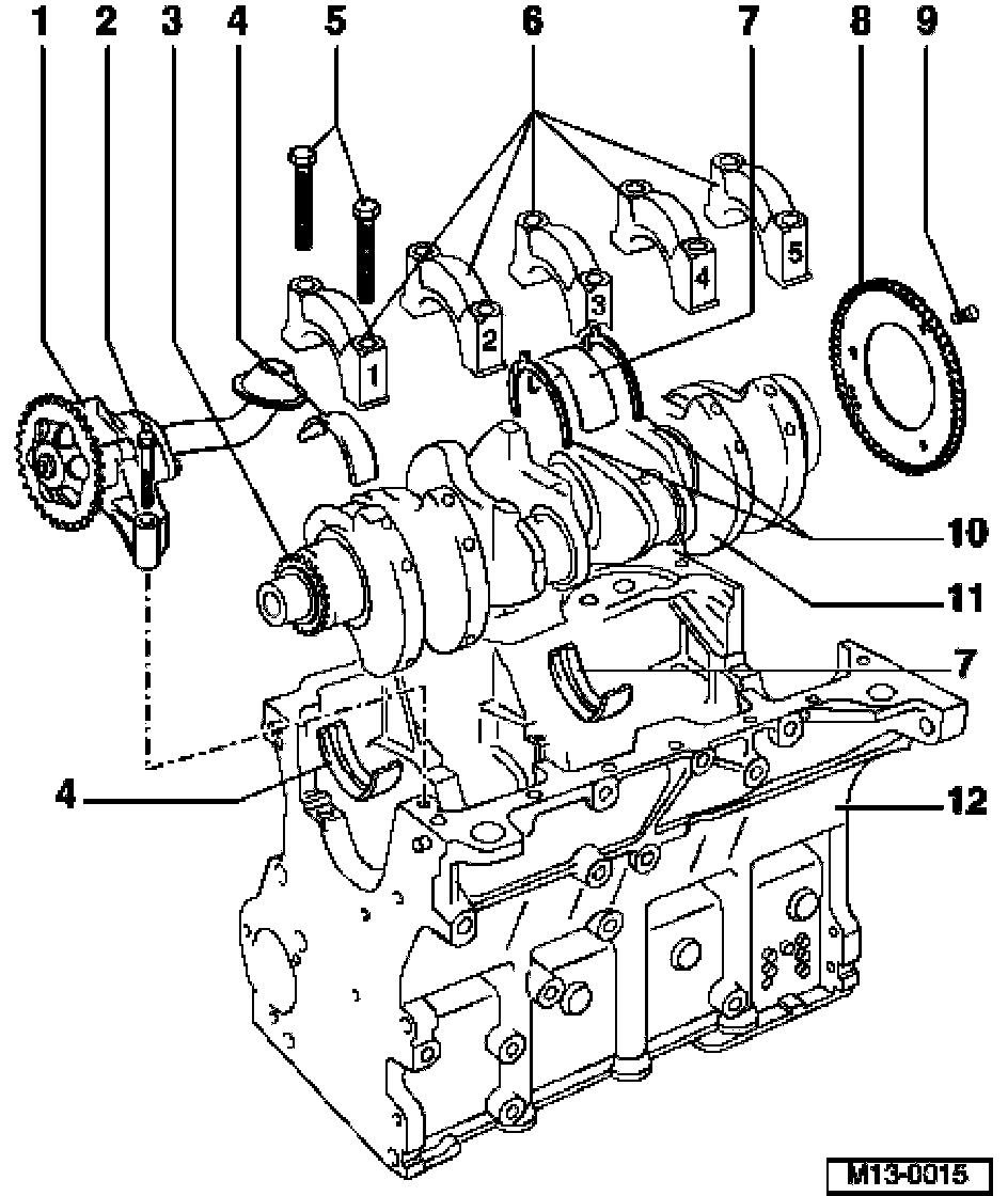 ^ Before removing the crankshaft, prepare a suitable surface so that the sensor wheel -8- is not making contact with anything and is not damaged.