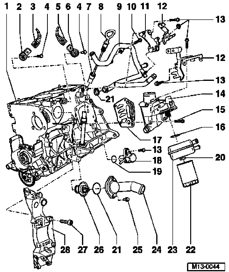 Note: If during engine repairs, metal shavings or large quantities of small metal particles - caused, for example, by partial seizure of crankshaft and conrod bearings - are found in the engine oil: To prevent consequential damage, besides thoroughly cleaning out the oil passages, you must also replace the oil cooler.