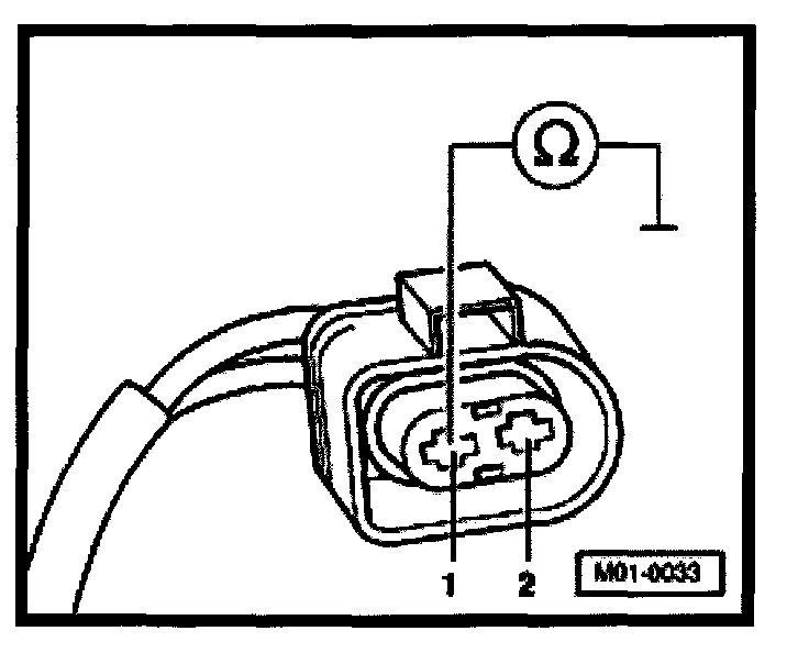 - Disconnect 2 pin connector -1- off secondary air injection pump motor -2- and connect VAG 1527B Voltage tester with auxiliary cables from VAG 1594 to disconnected connector.