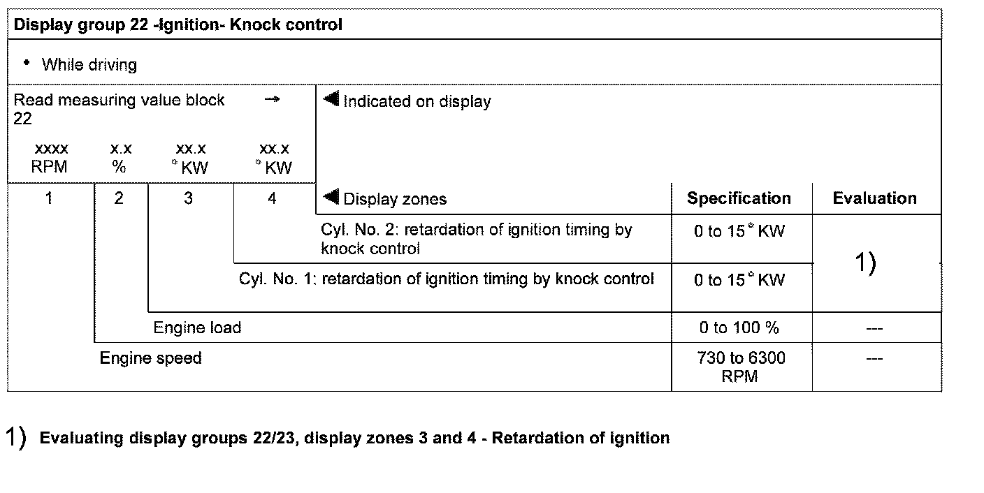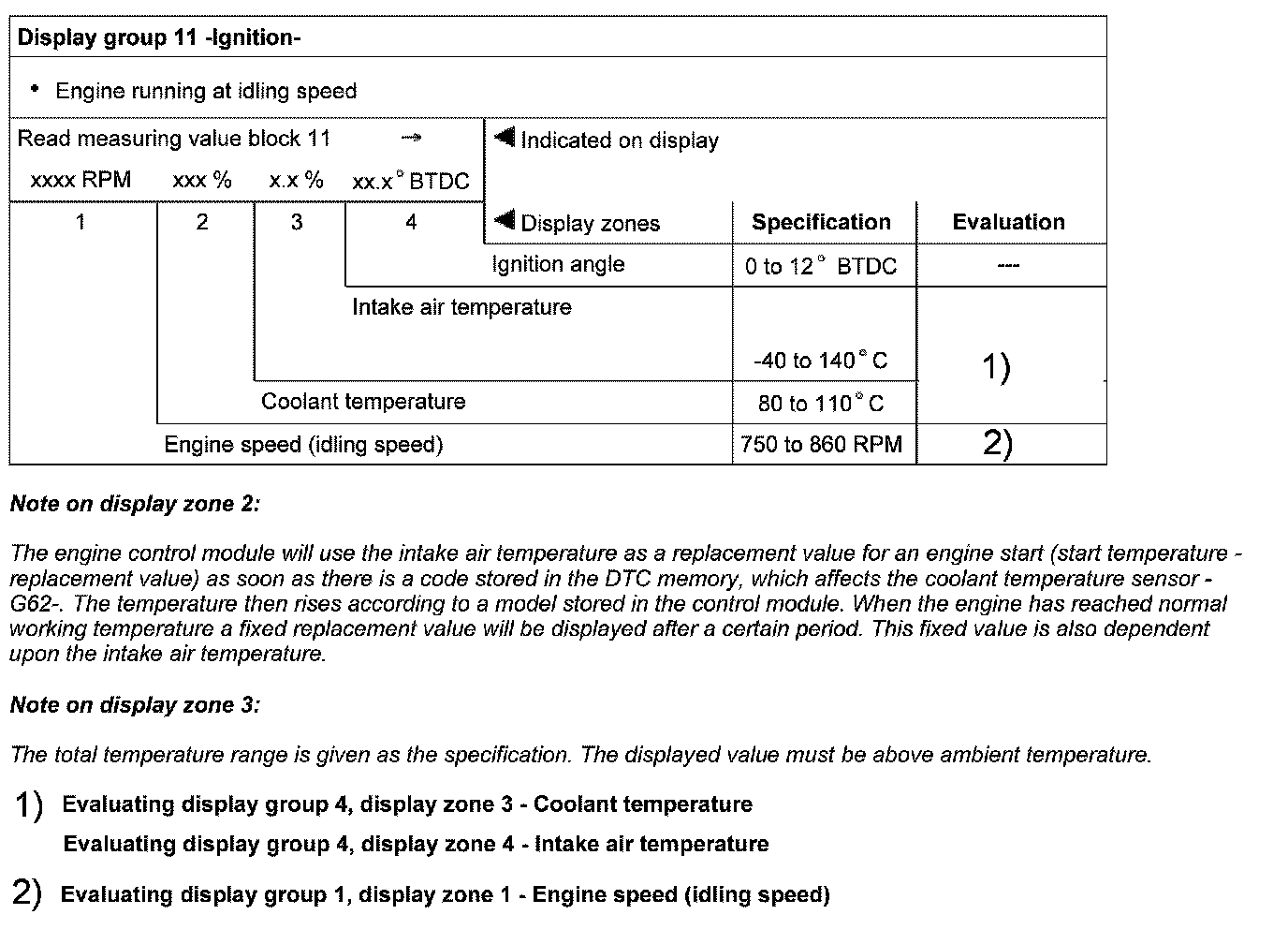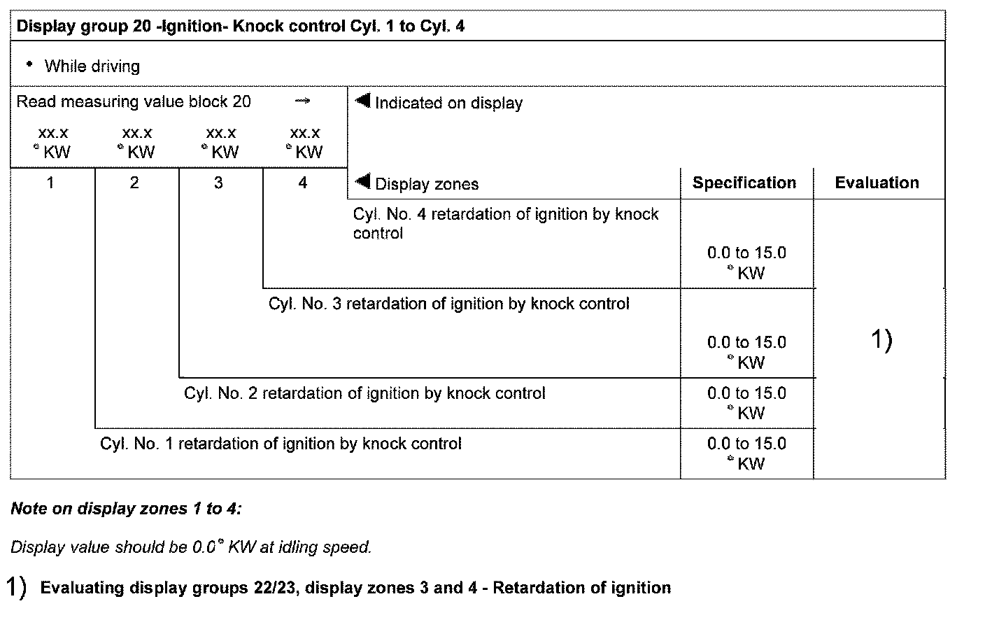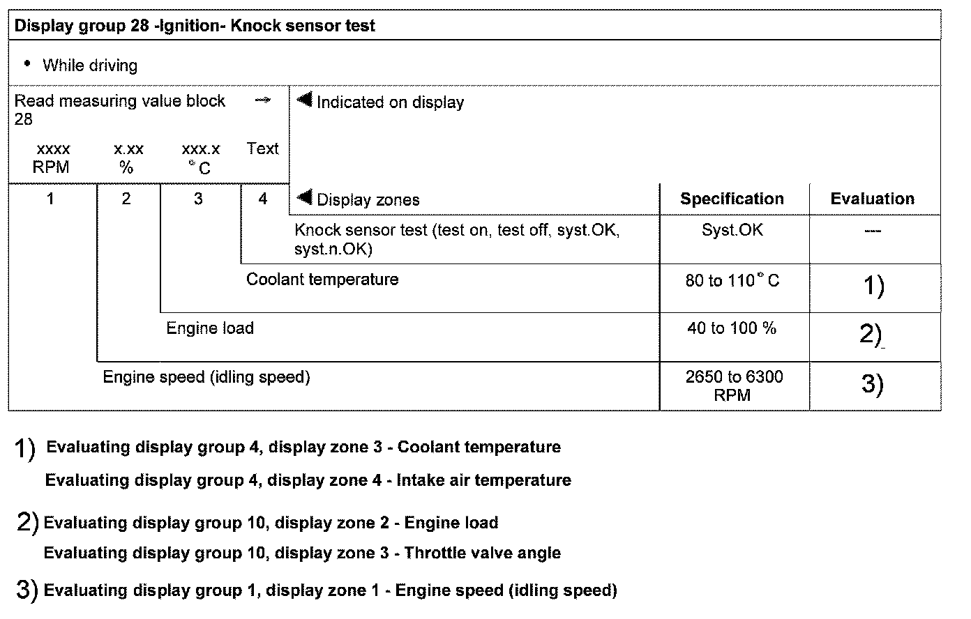 Measured value blocks, display groups 10 to 29 -Ignition-, evaluating