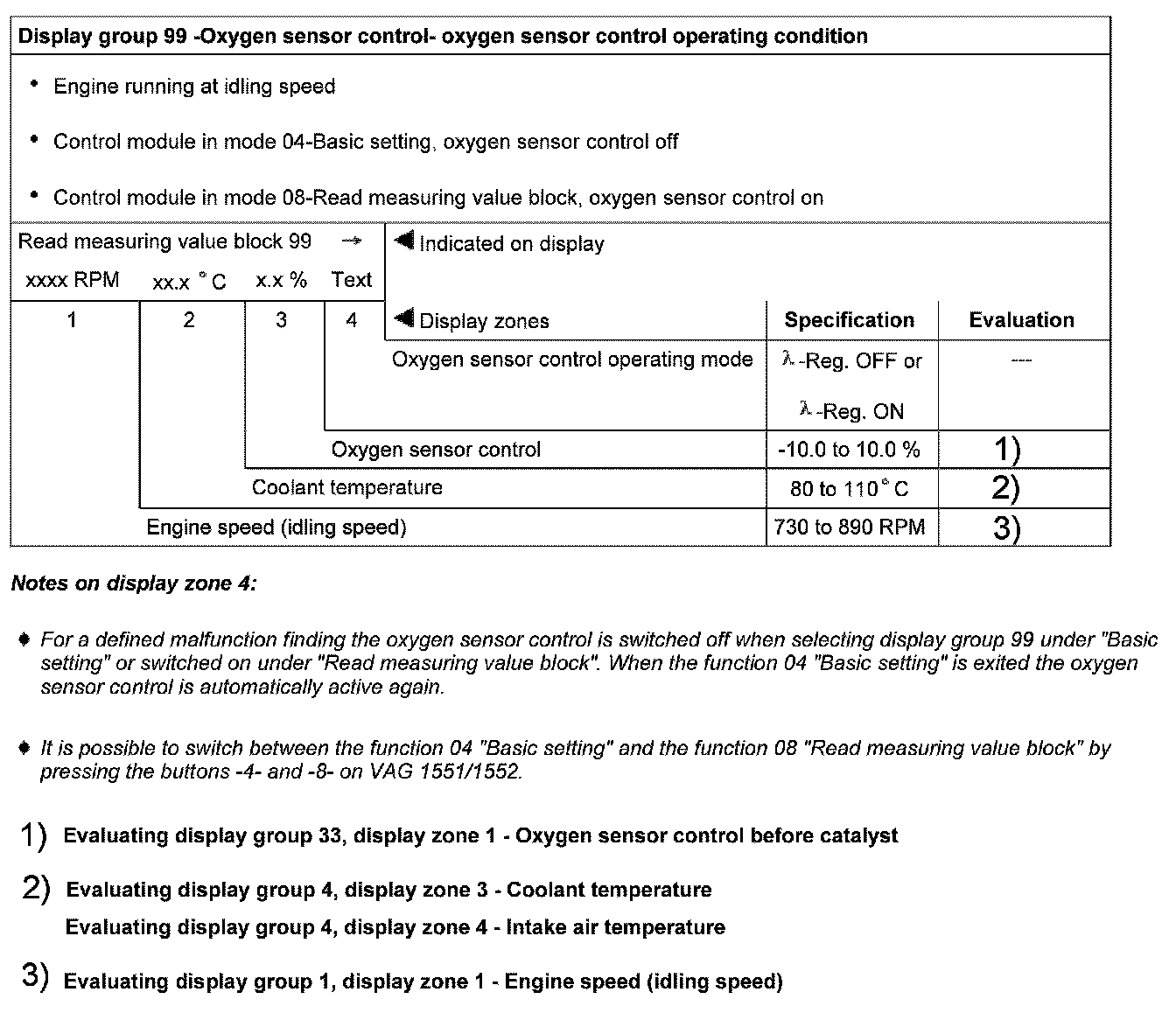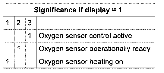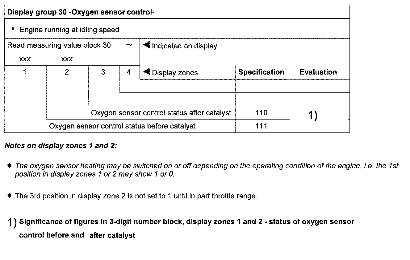 Significance of figures in 3-digit number block, display zones 1 and 2 - status of oxygen sensor control before and after catalyst