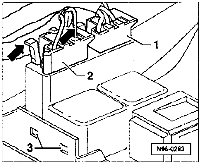 - Disconnect electrical connections -1- and -2- by depressing locking tabs -arrow-.