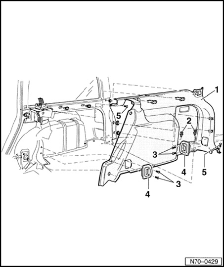 - Pull upholstery - 1 - in upper area out of clip - 4 -, press lower tab - 6 - to rear from sill panel - 7 - and remove upward with tab - 5 -.