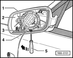 - Press screwdriver - 5 - in direction of - arrow - (clamp - 4 - releases mirror housing by doing this).