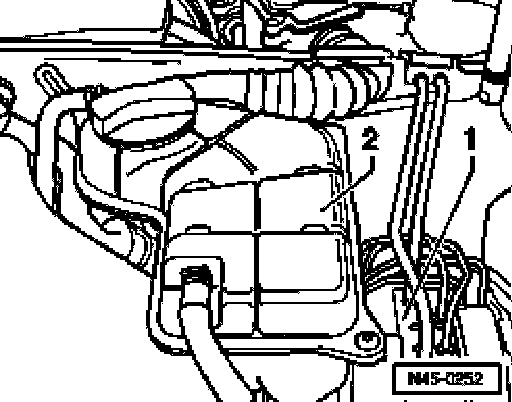 ^ Unscrew coolant expansion tank -2- and place to side with coolant hoses still connected.