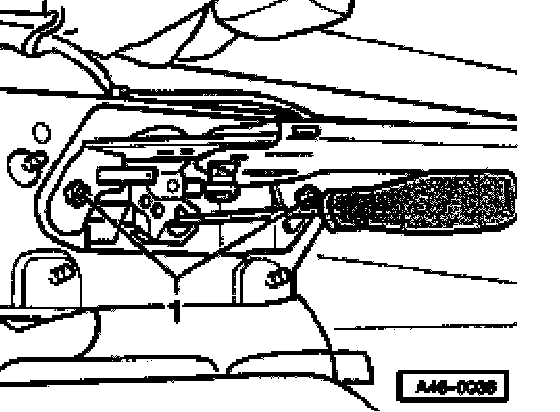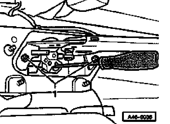 ^ Press parking brake cable inward with a screwdriver and remove parking brake lever.