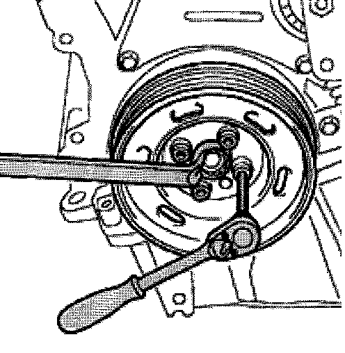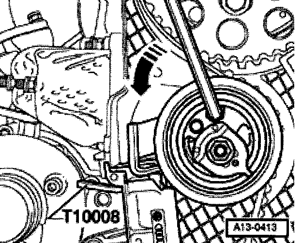 - Insert an hex wrench into hex socket up to stop and press tensioning roller in counter clockwise direction (in direction of arrow) with uniform non-excessive force until the tensioning device of the toothed belt can be aligned using T10008 locking plate.