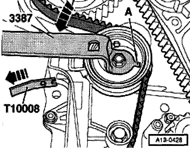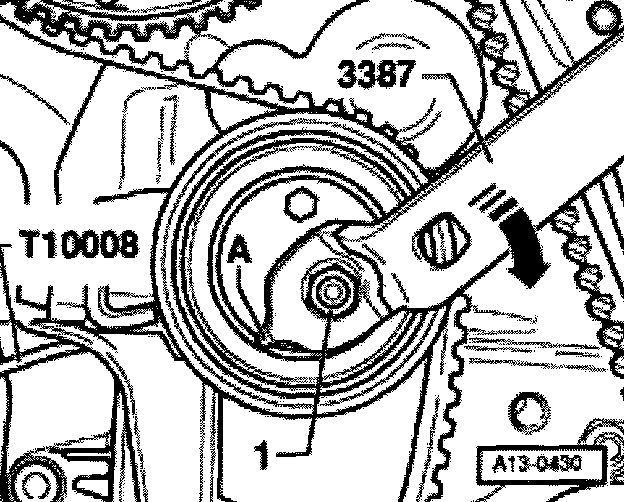 - Thread T10092 tensioning bolt into tensioning device for toothed belt.