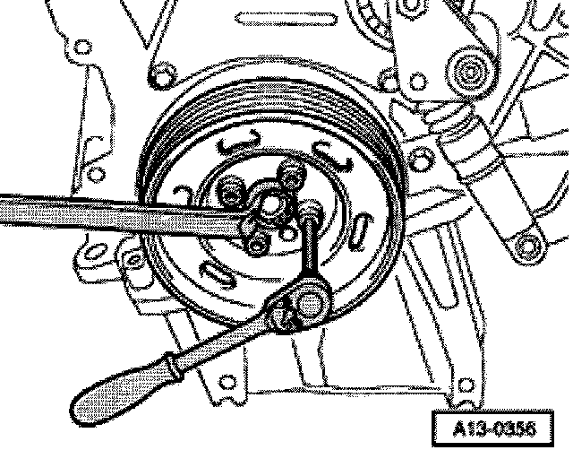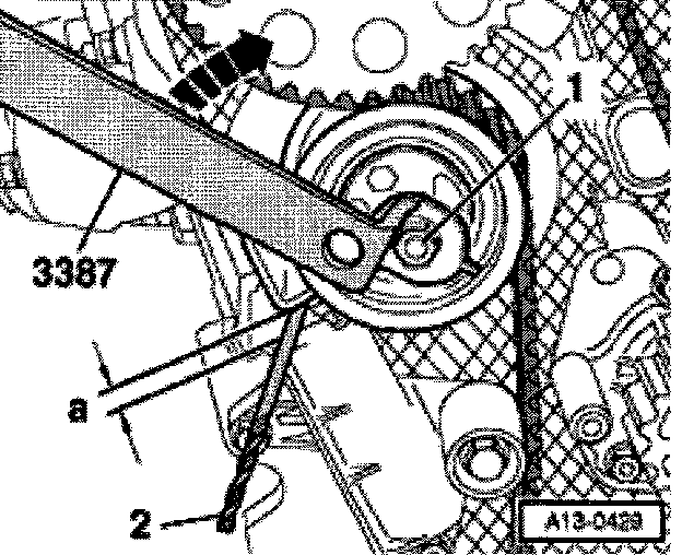 Note: If the toothed belt tensioning device is completely extended, it must be pressed back in installed position with the tensioning roller. This procedure can take up to 5 minutes. Excessive force during compression can damage tensioning roller.