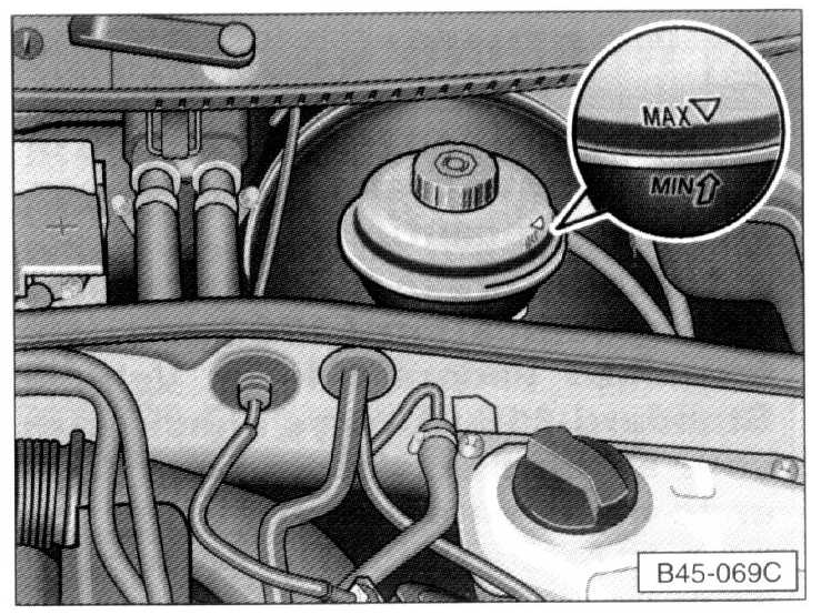 The correct fluid level is important for the proper functioning of the brake system. The fluid level in the brake fluid reservoir should always be between the "MAX" and "MIN" markings.
