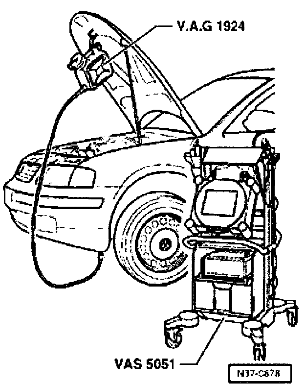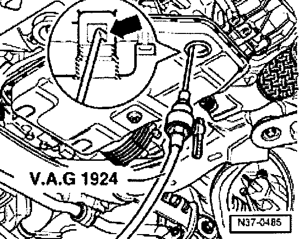 - Guide VAG 1924 in through an opening -arrow- in the deflector cap, taking care not to push the deflector cap upward out of position.