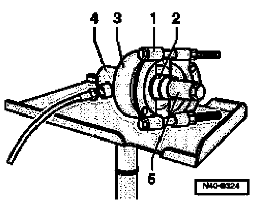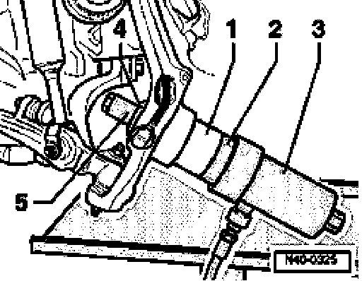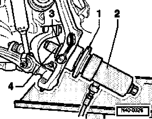 - Install press piece -1- with shoulder to bearing, press sleeve -2- with four stepped internal diameters to wheel bearing housing, hollow piston cylinder -3- with pull rod and special nut -4-.