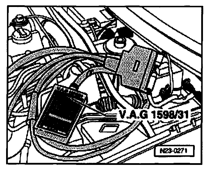 - Connect VAG 1598/31 adapter cable to control module wiring harness. Engine Control Module (ECM) is not connected.