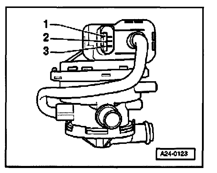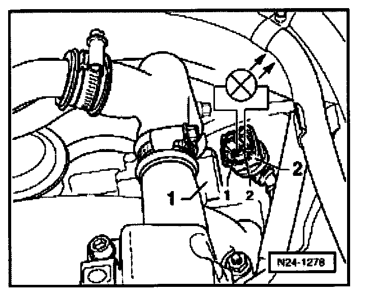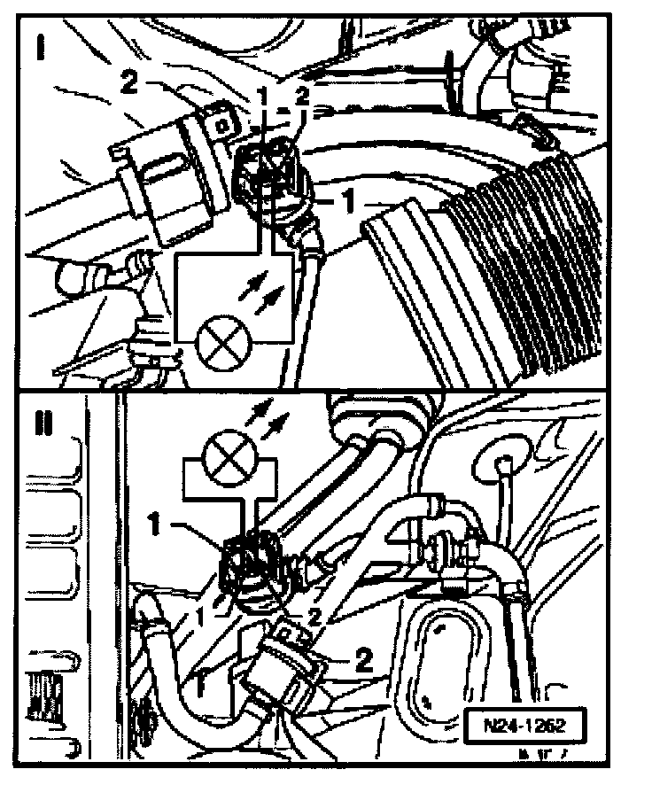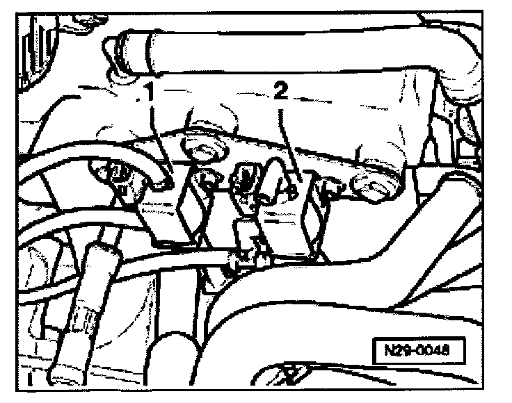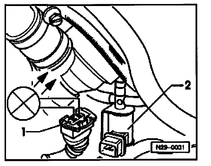 - Disconnect connector -1- from solenoid valve -2- and connect the VAG 1527B voltage tester to disconnected connector using an adapter from VAG 1594 connector test kit.
