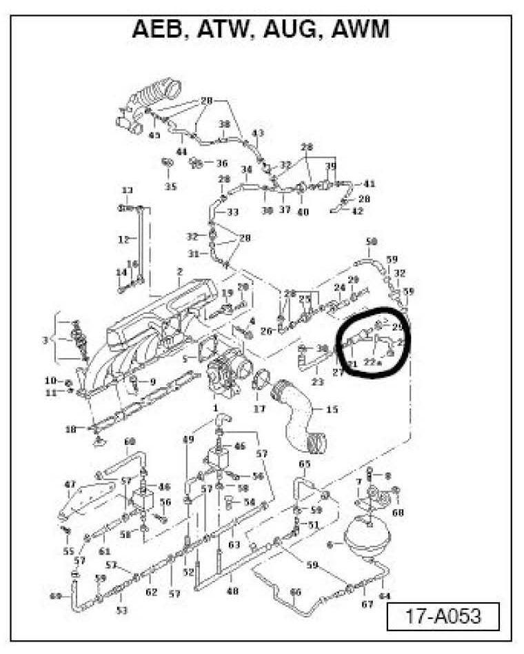 ^ Replace crankcase ventilation system hoses, pipes and pressure regulating valve depending on engine code (see circled items and compare to latest Parts Dept. illustration.