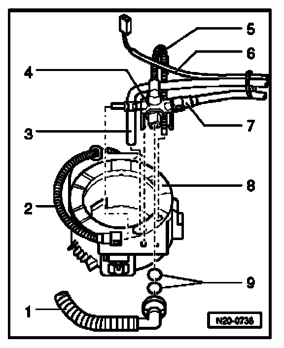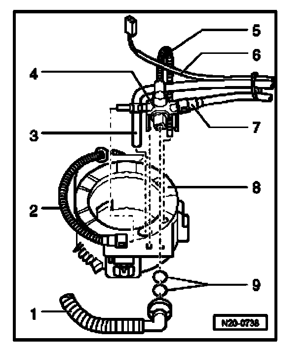- Take an assisting hose and blow into connection from side of fuel return -1-.