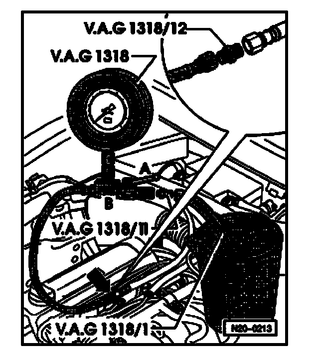 - Pressure Gauge V.A.G 1318 connected to fuel supply line of fuel supply tube