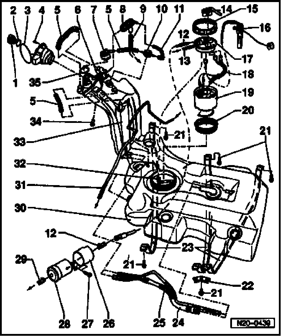 Note: After installing Fuel Pump (FP) flange, check whether supply, return and ventilation lines are still clipped in at fuel tank.