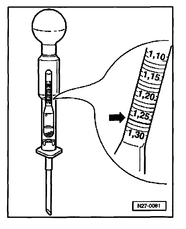 - Dip end of hydrometer into cell and extract sufficient electrolyte to allow indicator float to swim freely (the greater the electrolyte density in kg/cu.dm, the higher the indicator float position). Note each cell's specific gravity reading from float -arrow-. Repeat sequence until all cells are checked.