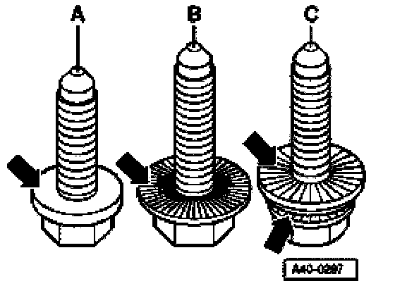 Bolt -C- has ribs on the underside of the bolt head and the washer.