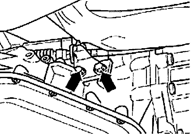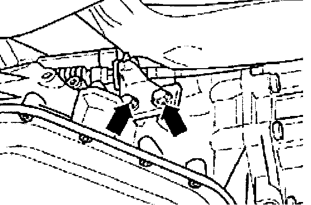 - Loosen bolts -arrows- securing support bracket to transmission.