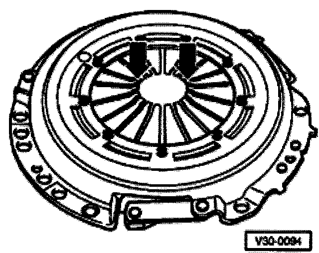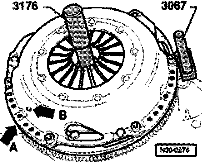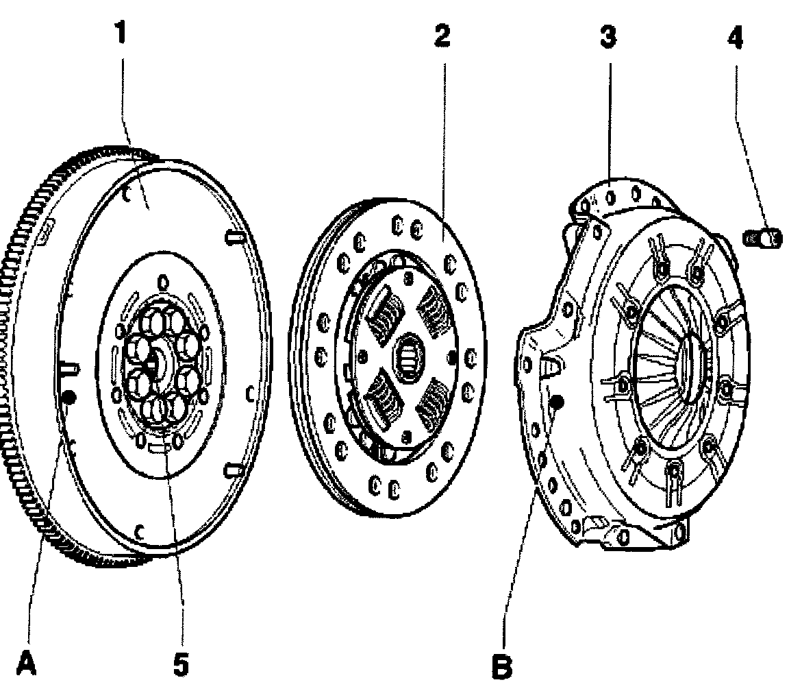 - If there are white spots on the dual mass flywheel -A- and pressure plate -B-, make sure that they line up when you assemble them.