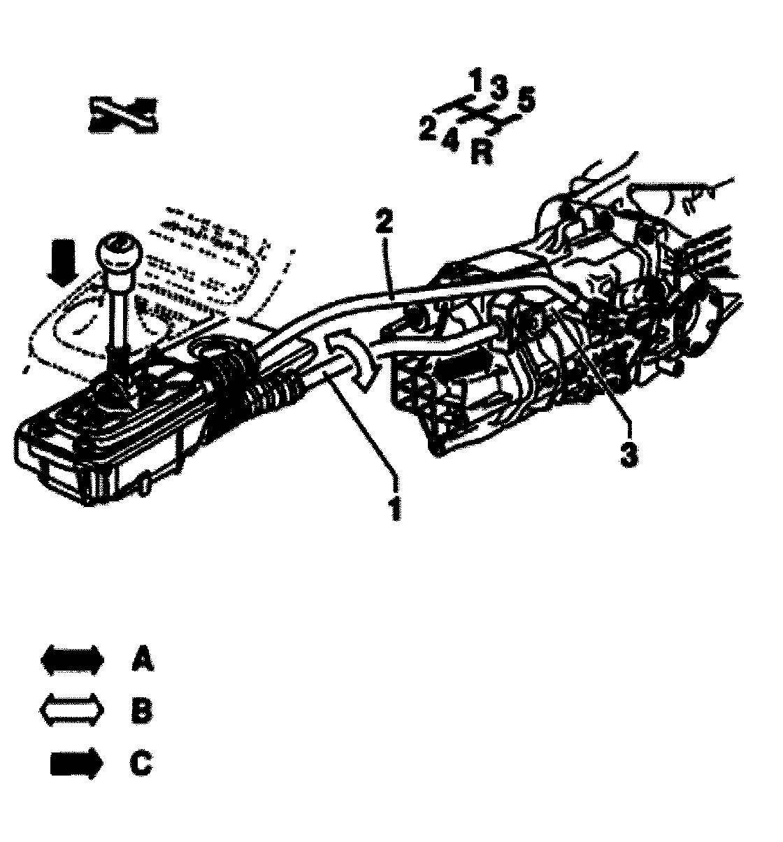 Arrow -C- Shift lever is pressed down to select reverse gear