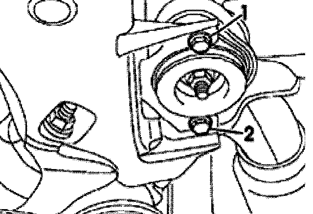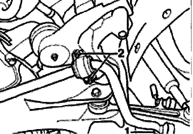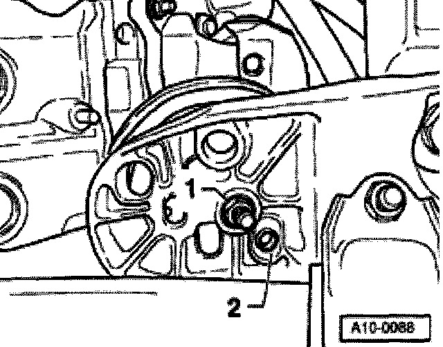 - Loosen rear right transmission mounting rear bolt -2- several turns, remove right transmission mounting front bolt -1-.